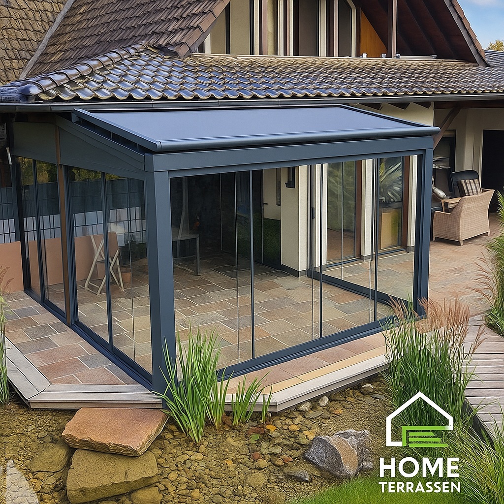 Stilvolle Terrassenüberdachung mit seitlicher Glasverkleidung für zusätzlichen Wind- und Wetterschutz.